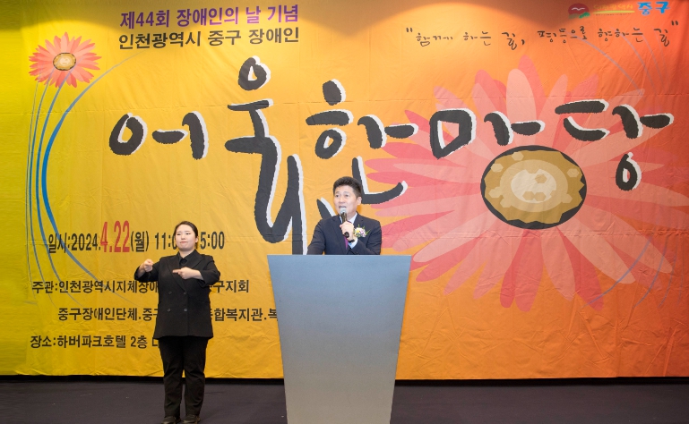 장애인 인식 개선과 복지 증진을 위해 인천시 지체장애인협회 중구지회가 주관한 이번 행사에는 김정헌 구청장, 강후공 구의회 의장, 배준영 국회의원, 유관 단체·기관 관계자, 장애인과 가족 등 450여 명이 참석했다.