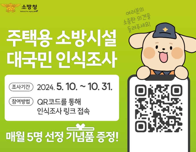 참여 방법은 네이버 폼 또는 하단 QR코드를 통해 기간 중 2회 참여가 가능하며, 매월 5명의 당첨자를 선정하여 소방 홍보 기념품을 증정한다.