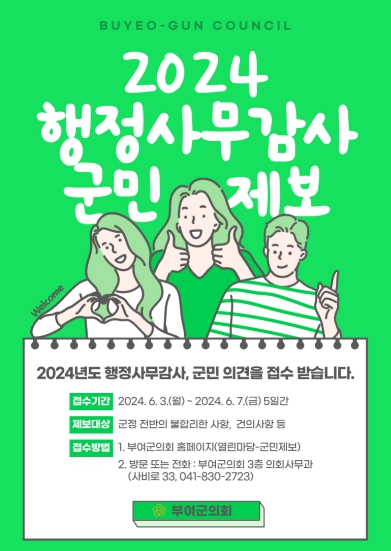 [뉴스서치] 부여군의회는 6월 7일까지 2024년도 행정사무감사와 관련해 군정 전반에 대한 군민제보를 접수받고 있다.