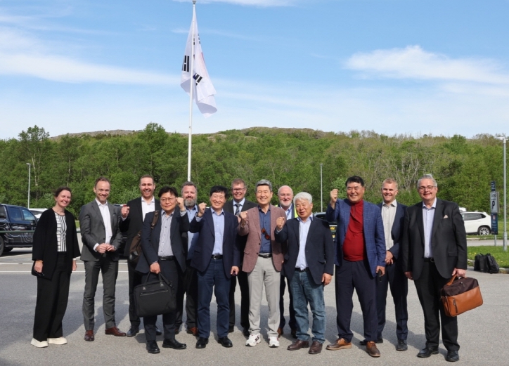 ▲ 유럽을 방문 중인 포항시 대표단이 지난 23일 노르웨이 로르빅에 위치한 스마트양식 기업인 닐스윌릭슨 관계자들을 만나 기념촬영을 하고 있다. |