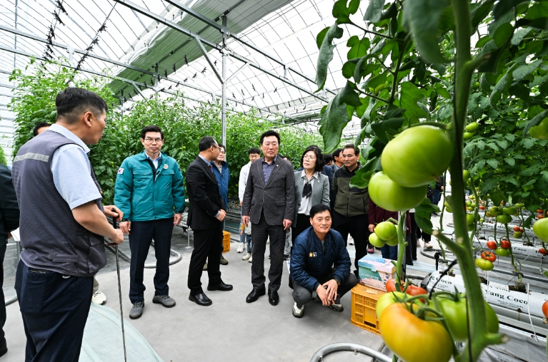 ▲ 김광열 영덕군수(왼쪽 2번째)와 영덕군의원들이 스마트팜 시범사업 대상 농장을 방문해 농작물을 관찰하고 있다. |