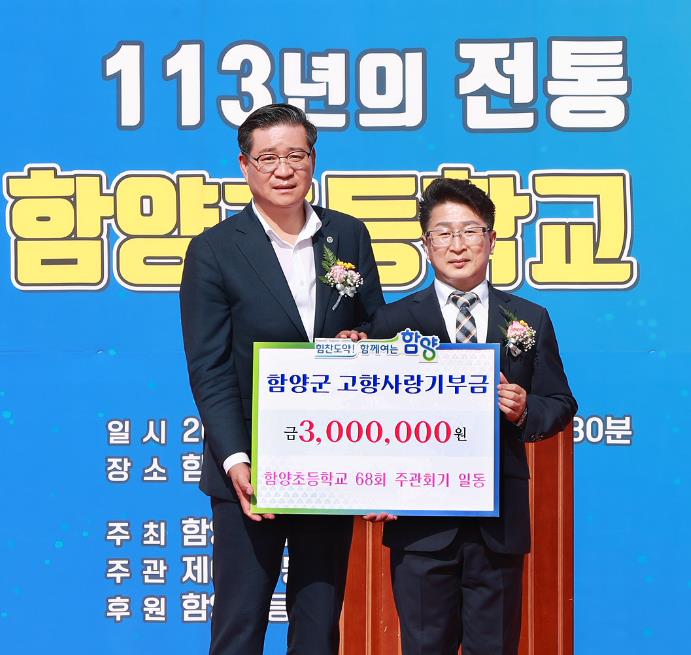 군에 따르면 지난 1일 함양초등학교 교정에서 열린‘제27회 함양초등학교 총동창회’개회식 현장에서 함양군의 희망찬 미래를 함께하고자 68회 주관회기 강선길 회장을 비롯한 동문 일동이 300만 원을 기부하며 고향사랑기부제에 동참했다.