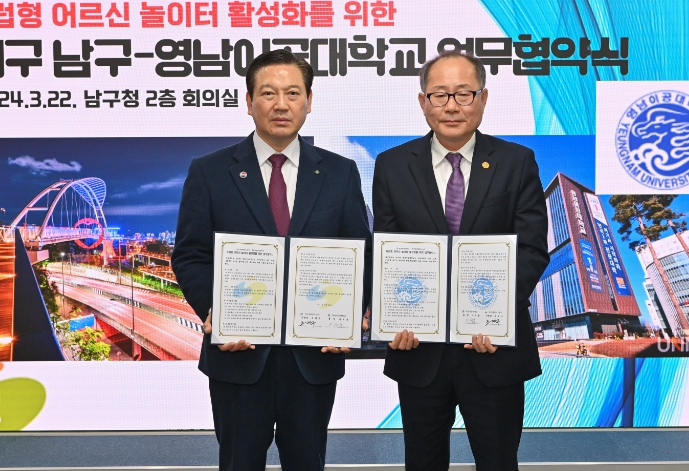 [뉴스서치] 대구 남구는 영남이공대학교와 22일 오후 1시 남구청 2층 회의실에서 유럽형 어르신 놀이터 운영 활성화를 위한 업무협약을 체결했다.