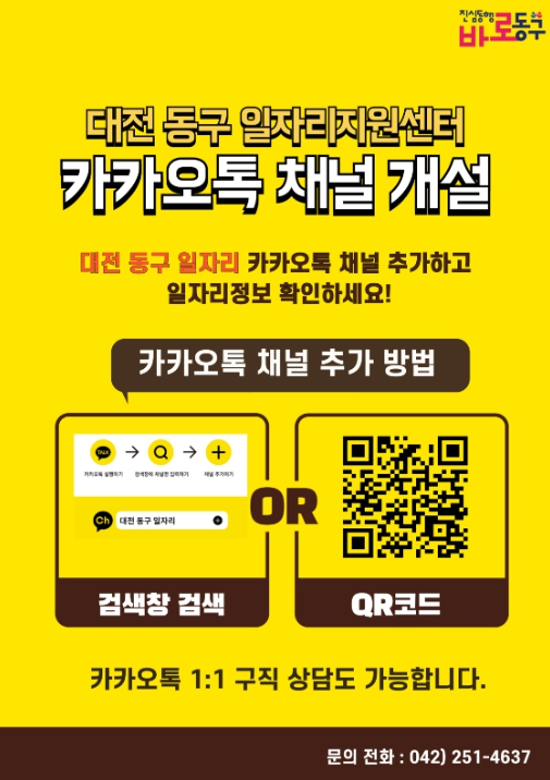 ‘대전 동구 일자리’ 카카오톡 채널은 카카오톡 상단 검색창 검색 또는 홍보물의 정보무늬(QR코드)를 통해 추가한 뒤 이용할 수 있으며 상담 가능 시간은 평일 오전 9시부터 오후 4시까지다.