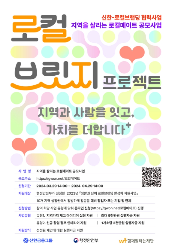 [뉴스서치] 행정안전부는 3월 29일부터 신한금융지주회사(회장 진옥동, 이하 ‘신한금융’)와 '로컬브랜딩 사업을 통한 지역경제 활성화 협력사업, 로컬브릿지 프로젝트'에 착수한다고 밝혔다.