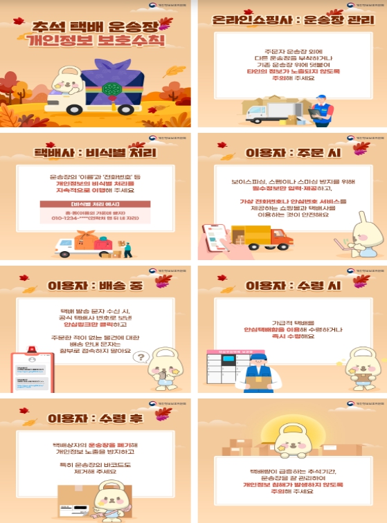 최근 추석을 맞이하여 택배 운송장 관리 소홀로 발생할 수 있는 개인정보 침해사례를 온라인쇼핑·택배사와 함께 공유하고, 이와 같은 개인정보 침해 사례가 재발하지 않도록 주의를 당부했다.