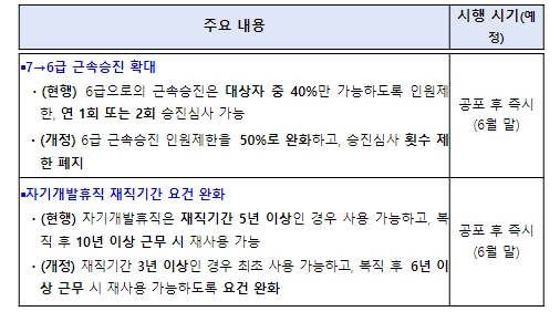 그간 7급→6급 근속승진은 기관별로 후보자의 40% 규모에서 연 1~2회 실시할 수 있었지만, 앞으로는 승진 규모를 50%로 확대하고, 승진심사 횟수 제한도 폐지한다.