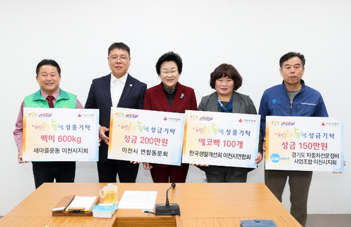 [뉴스서치] 지난 15일, 새마을운동(이천시지회), 한국생활개선(이천시연합회), 이천시연합동문회, 경기도자동차전문정비사업조합(CARPROS 이천시지회)가 성금과 성품을 기탁했다.