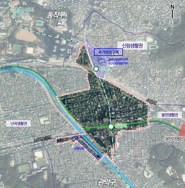 먼저 구는 지난 2022년에 개통된 신림선 당곡역의 동측 블록을 구역계에 편입, 편입 구역 중 제3종일반주거지역을 준주거지역까지 용도지역 상향이 가능하도록 했다. 이를 기반으로 개발 규모, 공공기여 등에 대한 사업계획 수립을 통해 준주거지역으로 용도지역 상향이 가능해졌다.