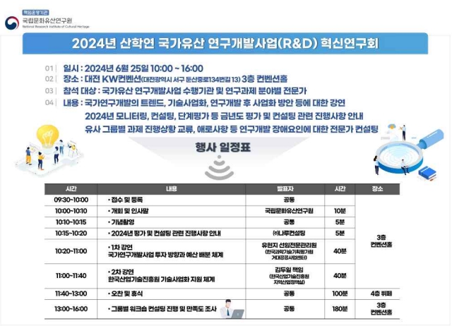[뉴스서치] 국가유산청 국립문화유산연구원(원장 김연수)은 6월 25일 오전 10시 대전 KW 컨벤션센터(대전 서구)에서 국가유산 연구개발사업(R&D)인 ‘국가유산 스마트 보존활용 기술개발’연구과제 수행기관 관계자 100여 명을 대상으로 사업의 정책방향 및 기술사업화 방안에 대한 강연과 전문가 상담(컨설팅)을 진행하는 혁신연구회를 개최한다.