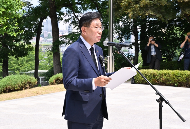 추념식은 오전 10시 정각 사이렌 취명에 맞춰 1분간 묵념으로 시작해 ▲국기에 대한 경례 ▲헌화와 분향 ▲헌시낭독 ▲추념사 ▲현충의 노래제창 순으로 진행됐다.