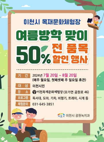 [뉴스서치] 이천시는 7월 20일 이천 관내 학교들의 여름방학을 맞아 목재문화체험장 전품목 50% 할인 행사를 개최한다고 밝혔다.