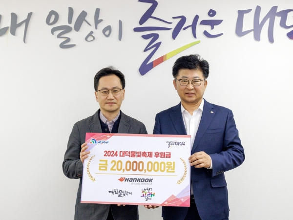 [뉴스서치] 대전 대덕구는 19일 한국타이어앤테크놀로지 대전공장으로부터 ‘2024 대덕물빛축제’의 성공적인 개최를 위한 후원금 2000만원을 기탁받았다고 밝혔다.