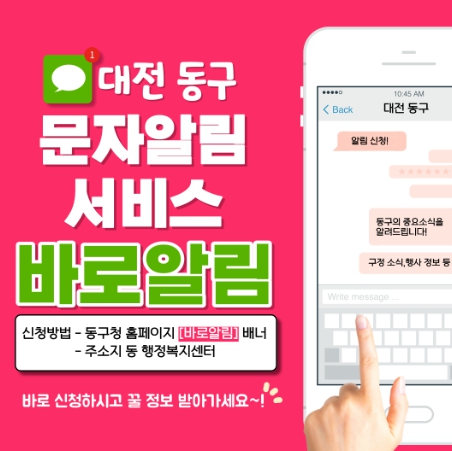 [뉴스서치] 대전 동구는 사회관계망(SNS) 사용에 익숙지 않은 구민들도 손쉽게 구정소식을 제공받을 수 있도록, 매월 2회 주요 구정소식과 지역정보 등을 문자로 발송해 주는 구정소식 문자서비스 ‘바로알림’을 시행한다고 18일 밝혔다.