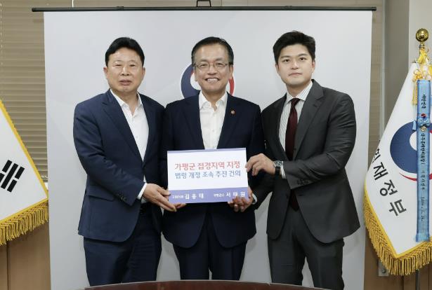 ▲ 서태원 가평군수는 김용태 국회의원과 함께 9일 기획재정부를 방문, 가평군의 접경지역 지정에 대해 적극적인 협조를 요청했다. 사진 왼쪽부터 서태원 군수, 최상목 기획재정부장관, 김용태 의원. |