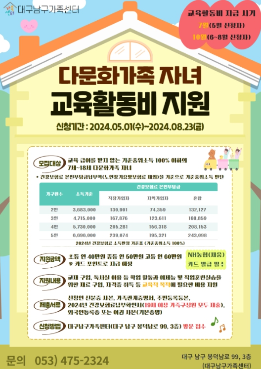 ▲ 대구 남구가족센터‘다문화가족 자녀 교육활동비 신청하세요!’ |
