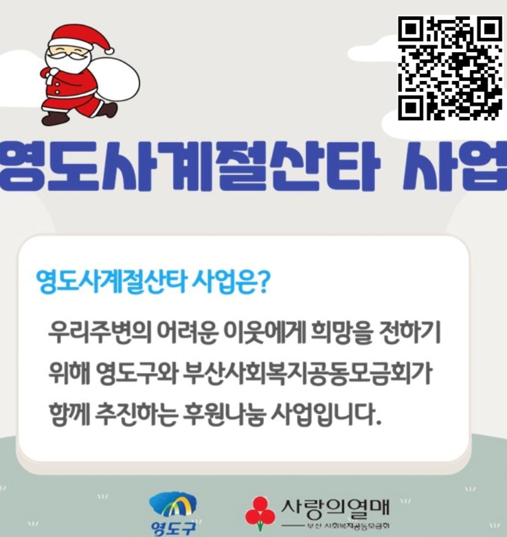 한편, 영도사계절산타사업은 영도구와 부산사회복지공동모금회의협약사업으로 경제적 빈곤, 사회적 소외 등으로 어려움을 겪고 있는 취약계층 지원을 위해 뜻있는 주민들의 자발적인 후원참여로 운영되고 있다.