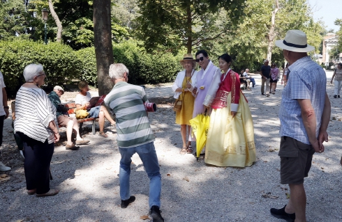 ▲ 1. 베네치아 비엔날레 현장에서 시그니처 한복을 입고 온 박경귀 아산시장과 이유영 문화예술과장이 외국인 관람객의 요청으로 사진을 찍고 있는 모습 |