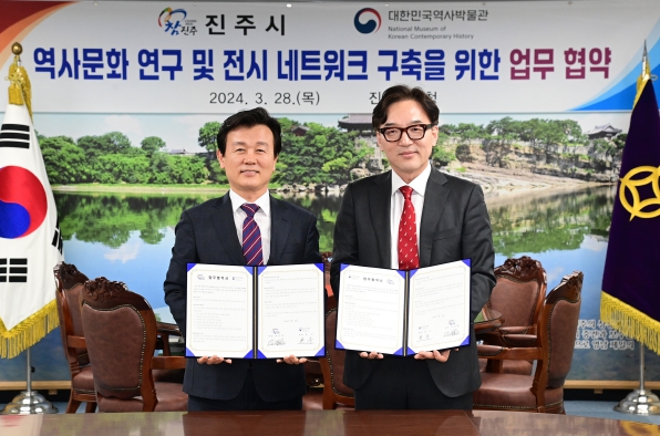 [뉴스서치] 진주시는 28일 시청 기업인의 방에서 대한민국역사박물관과 지역 역사문화 발굴 및 연구, 전시 네트워크 구축을 위한 업무협약을 체결했다.