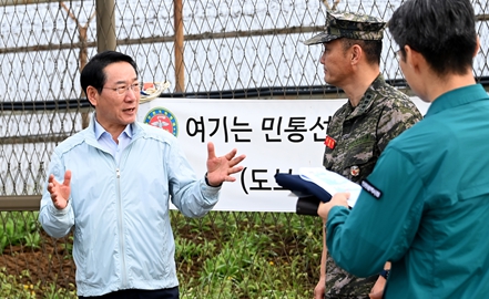 ▲ 유정복 인천광역시장이 9월 18일 강화군 송해면 당산리 대남 소음방송 현장을 찾아 군 관계자로부터 현황을 보고받고, 주민들의 애로사항을 청취하고 있다. |