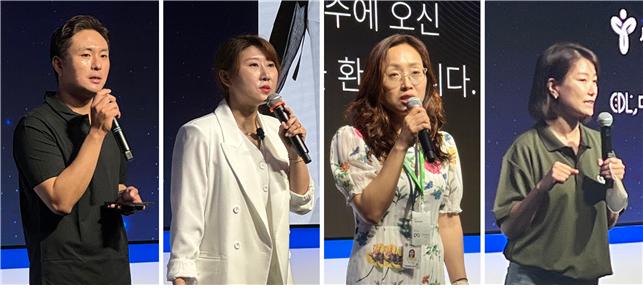 ▲ 메타코리아에서 진행된 서울시교육청 학교예술교육지원단 교사 대상 VR 아트 연수 강연자 모습(왼쪽부터 김문일 메타코리아 부장, 피오니 VR 아티스트, 윤석미 서울시교육청 체육건강예술교육과 장학사, 김묘은 디지털리터러시협회 대표) |