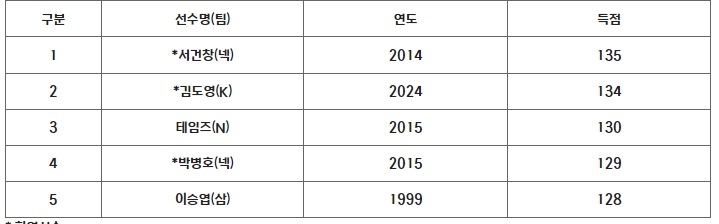 ▲ 역대 한 시즌 최다 득점 TOP5 9/16(월) 기준 |
