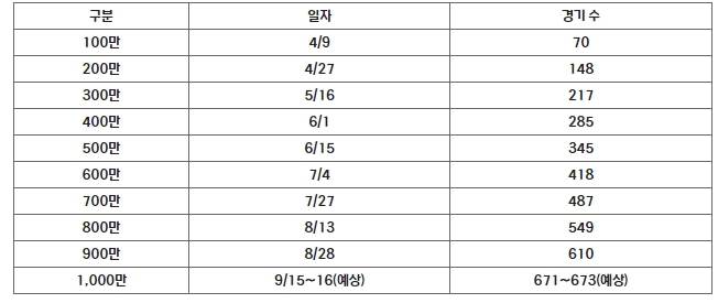 ▲ 2024 시즌 100만 단위 달성 일자 및 경기 수 |