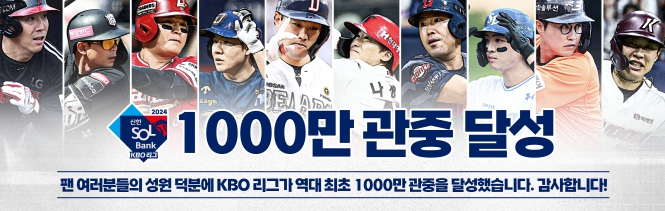 [뉴스서치] 2024 신한 SOL뱅크 KBO 리그는 9월 15일(일) 경기에서 누적 관중 1,000만명을 달성하며 KBO 리그의 역사를 새로 썼다.