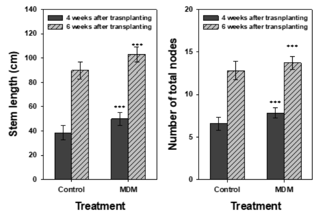 두 농가 모두에 메소나를 물과 함께 준 후 아주심기 했다. 아주심기 직후 저온 스트레스를 줄이고 초기 생육을 좋게 하고자 뿌리고와 메소나를 1~2주 간격으로 물과 함께 줬다. 그 결과, 야간 저온 피해가 약간 있었음에도 미생물제를 처리하지 않은 수박보다 초기 생육이 12~17% 증가했다.