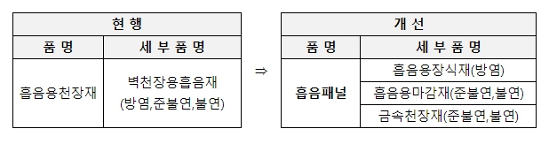 그동안 조달청은 방화성능이 상이한 실내장식용과 마감재를 ‘벽천장용흡음재’ 하나의 품명으로 묶어 계약함에 따라 수요기관이 제품의 방화성능을 확인하고 구매하는 데 많은 어려움을 겪어왔다.