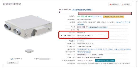 ▲ (예시) 나라장터종합쇼핑몰 부품 원산지 표시 화면 |