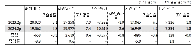 자연증가(출생아 수 - 사망자 수)는 –10,614명이다.