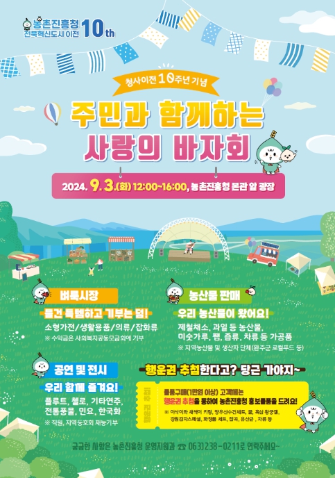 [뉴스서치] 농촌진흥청은 전북혁신도시 이전 10주년을 기념해 9월 3일 본청 본관 앞 광장에서 ‘주민과 함께하는 사랑의 바자회’를 연다. 농촌진흥청은 지난 2014년 7월, 52년간의 경기 수원 시대를 마감하고 전북혁신도시로 이전해 올해로 10년째를 맞고 있다.