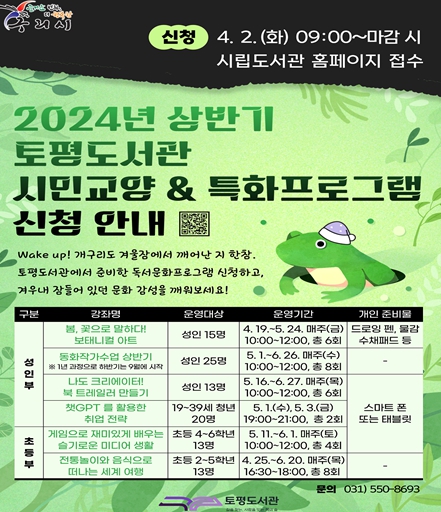 ▲ 토평도서관 2024년 상반기 시민교양 및 특화프로그램 신청 안내문 |