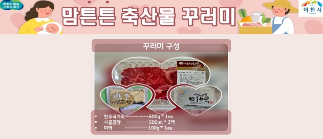 [뉴스서치] 이천시 축산과에서는 올해 출산 후 이천시에 출생신고를 한 산모에게 산모의 건강 회복과 축산물 소비 촉진을 위한 ‘맘튼튼 축산물 꾸러미 지원 사업’을 내달 2일부터 내년 1월 31일까지 경기민원24 홈페이지를 통해 지원한다고 밝혔다.
