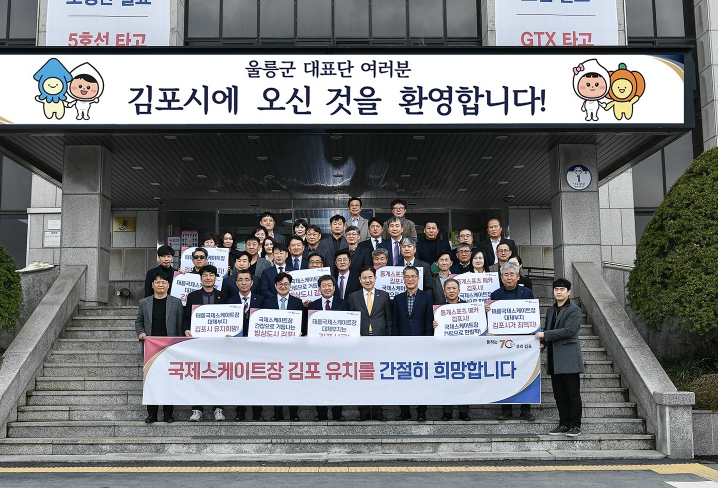 포문은 울릉군에서 열었다. 김포시와-울릉군의 친선 결연 협약식을 위해 지난 28일 김포시를 찾은 남한권 울릉군수를 비롯한 울릉군 체육회 인사들은 협약식을 마치고 김포시의 국제스케이트장 유치를 응원하며 현수막과 피켓을 들었다.