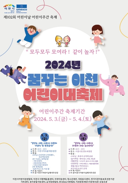 [뉴스서치] 이천시는 제102회 어린이날을 맞이하여 이천시가 주최하는 제2회 “2024년 꿈꾸는 이천 어린이 대축제!”어린이날 행사를 5월 3일 ~ 4일 개최한다고 밝혔다. 5월 3일은 10시부터 12시까지 이천아트홀에서 기념식과 축하공연이 진행되고, 4일은 10시부터 15시까지 시청사 모두의 광장에서 가족들이 함께 즐길 수 있는 다양한 놀이마당(에어바운스)과 게임존, 공연, 체험부스, 푸드트럭 등 다채로운 놀거리를 마련했다.