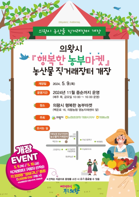 또 개장 행사로 5월 9일부터 10일까지 구매하는 시민을 대상으로 농협중앙회 의왕시지부와 의왕농협에서 준비한 장바구니를 선착순으로 증정할 예정이다.