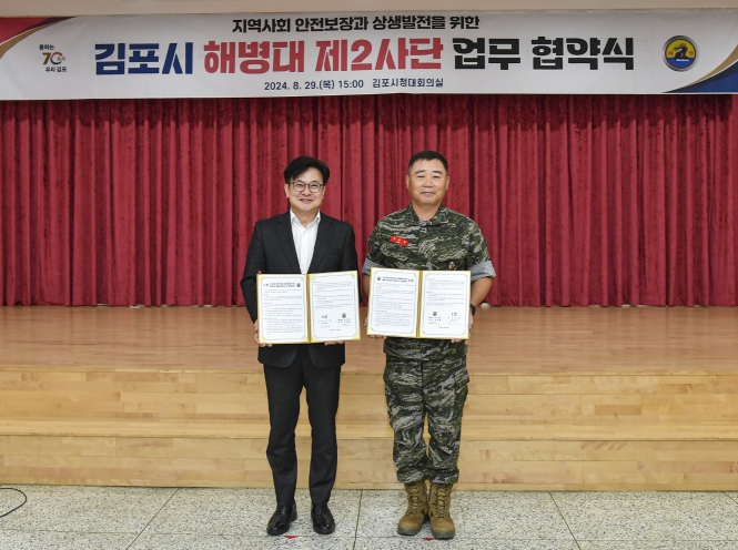 김포시와 해병대 제2사단은 지난 8.29.(목) 김포시청 대회의실에서 김포시장(김병수)과 해병대 제2사단장(해병 소장 정종범) 등 관계자들이 참석한 가운데 관·군 상생발전을 위한 협약(MOU)을 체결했다.