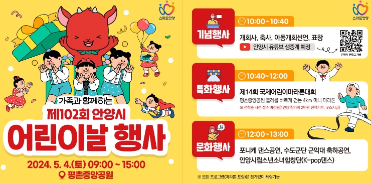 안양시는 제102회 어린이날(5.5.)을 맞아 5월 4일 평촌중앙공원에서 세계 최초 아동권리기관인 세이브더칠드런의 ‘제14회 국제어린이마라톤’ 대회와 함께 ‘어린이날 행사’를 개최한다고 1일 밝혔다.