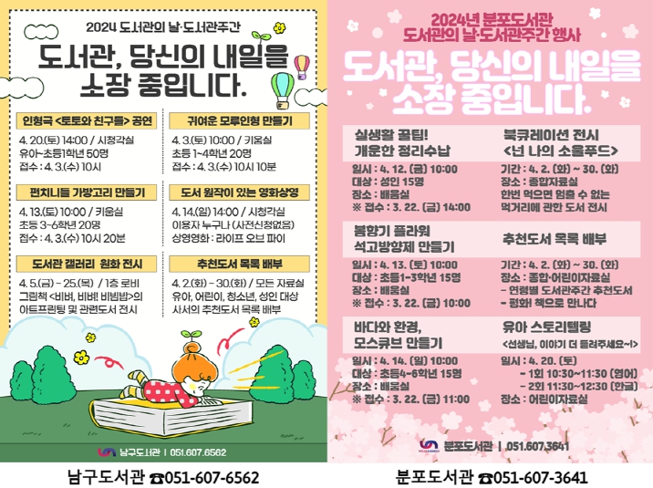 참가 신청은 오는 3월 22일 금요일부터 남구 도서관 누리집에서 할 수 있다. 각 프로그램별 세부 사항은 도서관 누리집 또는 SNS를 확인하거나 남구도서관, 분포도서관으로 문의하면 된다.