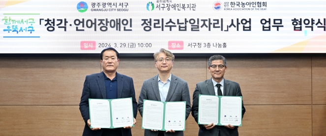 [뉴스서치] 광주광역시 서구가 29일 서구장애인복지관, (사)한국농아인협회 광주광역시 서구지회와 청각·언어장애인 정리수납 일자리 사업 업무협약을 체결했다.