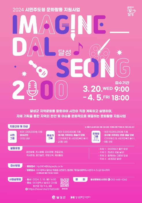 [뉴스서치] 달성문화재단 달성문화도시센터(이사장 최재훈)가 4월 5일까지 시민과 문화 예술 단체들의 문화활동 지원을 위한 시민주도형 문화활동 지원사업 ‘Imagine-달성2000’을 공모한다고 밝혔다.