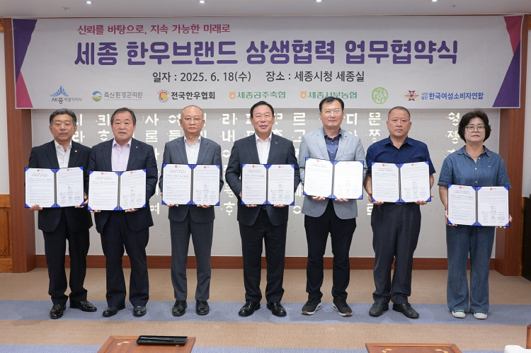 협약식에는 전국한우협회 세종시지부, 세종공주축산농협, 세종서부농협, 무지개영농조합법인, (재)축산환경관리원, 한국여성소비자연합 세종시지부 등 7개 기관·단체가 참여했다.