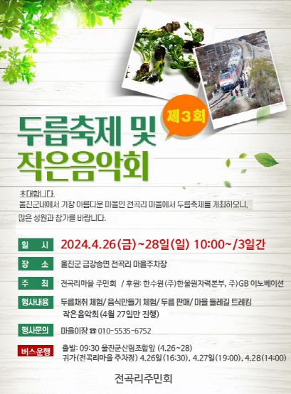 [뉴스서치] 울진군은 26일부터 28일까지 3일간 금강송면 전곡리에서 봄맞이 두릅 축제 및 작은 음악회를 개최한다고 밝혔다.