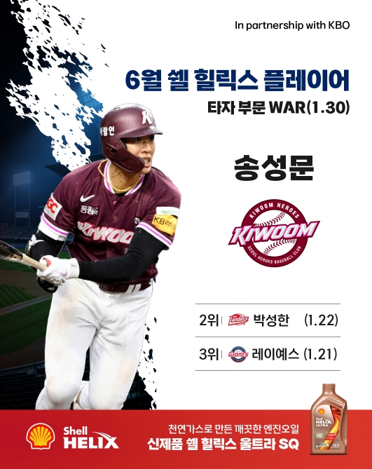 한편, 한국쉘은 최상의 엔진 성능 유지를 통해 운전자의 ‘드라이빙 열정(Passion for Driving)’을 응원하는 브랜드 캠페인 ‘쉘 힐릭스 드라이브-온(Shell Helix Drive On)’의 일환으로, KBO 리그 선수들이 최고의 야구 퍼포먼스를 발휘할 수 있도록 앞으로도 매월 ‘쉘힐릭스플레이어’ 시상을 후원할 예정이다.