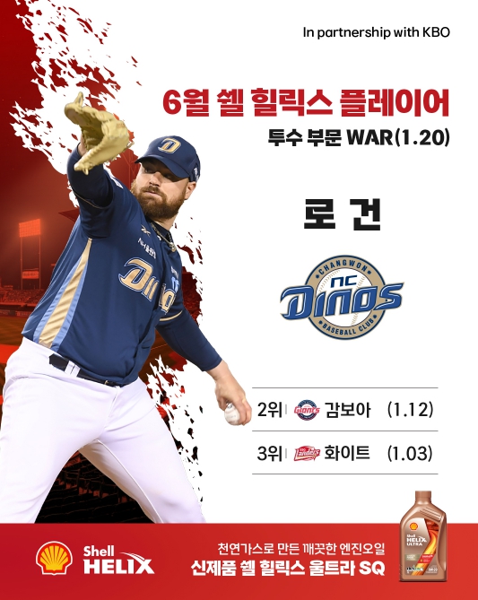 ‘쉘힐릭스플레이어’는 WAR(대체 선수 대비 승리 기여도)을 기준으로 선정하며, 6월 투수 부문에서는 NC 로건이 WAR 1.20으로 1위를 차지했다. 로건은 6월 한 달간 리그에서 가장 많은 33이닝을 투구했으며, 3승(공동 2위)을 거두면서 평균자책점 1.91(2위)을 기록했다. 또한, 탈삼진 33개(5위), 피안타 27개(공동 9위), WHIP 1.15(8위) 등 주요 지표에서도 상위권에 기록하며 퀄리티스타트를 5차례 기록하는 등 선발투수로서의 역할을 충실히 해냈다.