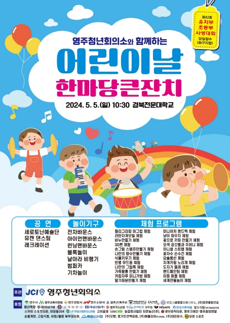 영주청년회의소에서 주관하는 어린이날 한마당큰잔치는 5일 오전 10시 30분부터 경북전문대학교에서 개최된다. 이날 전차바운스, 아이언맨바운스, 범퍼카, 기차놀이 등 놀이기구 체험과, 캘리그라피머그컵, 미니어처핸드백, 키링, 도자기물레 등 20여종 이상의 만들기 체험 및 그림그리기 대회도 함께 진행된다.
