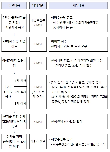 해양수산부와 해양수산과학기술진흥원은 접수된 기술에 대해 30일간 이해관계자 의견 수렴을 거쳐 신기술 여부를 검증한 후, 기술분야별 전문분과위원회를 통해 1차 서류심사로 기술성, 경제성 등을 평가한다. 이어, 2차 현장심사와 3차 종합심사위원회 심사를 거쳐 접수후 120일 이내에 ‘우수 물류신기술’을 선정하고 지정증서를 수여할 계획이다.
