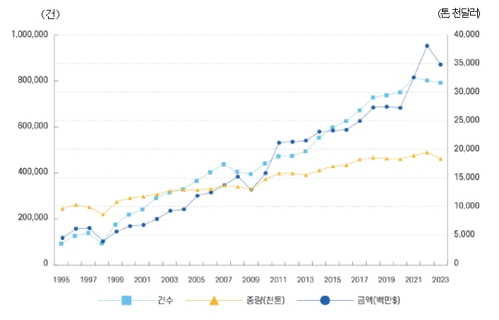 [뉴스서치] 식품의약품안전처는 2023년 국내로 수입된 식품 등은 165개 국가에서 79만2천여건, 1,838만톤, 348억 2천만 달러 상당으로, 전년 대비 수입건수는 1.2%, 중량은 5.6%, 금액은 8.6%가 감소했다고 밝혔다.